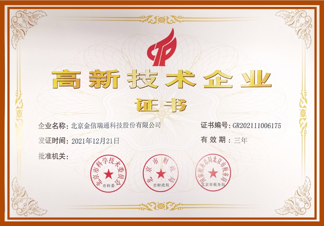 5月20日,北京金信瑞通成功加入中關村高新技術企業,并榮獲...